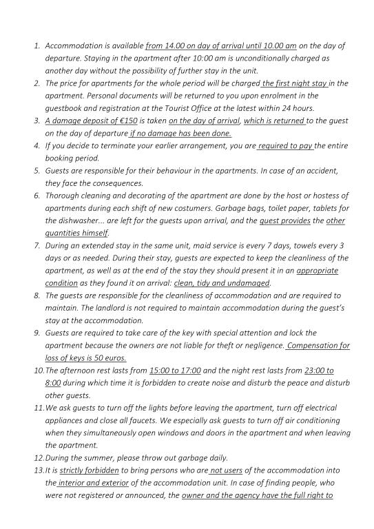 Прочитай выше Единица размещенияДо ТРЕХ ночей цена на 30% ДОРОЖЕ; ДОПОЛНИТЕЛЬНЫЙ ЧЕЛОВЕК платит 10 евро за ночь в зависимости от сезона. ВРЕМЯ ЗАЕЗДА: после 14:00; ВРЕМЯ ВЫЕЗДА: до 10:00; ПРЕДОПЛАТА составляет 30% от общей суммы, остальная часть при заезде в апартаменты; ЗАЛОГ НА СЛУЧАЙ УЩЕРБА составляет 150 евро, гость оплачивает его при заезде в апартаменты, если ничего не сломано, он возвращается при выезде; В доме есть ОДНО ПАРКОВОЧНОЕ МЕСТО на каждые апартаменты; ЗАПРЕЩЕНО: приводить с собой людей, не являющихся пользователями жилья, шуметь с 15:00 до 17:00 и с 23:00 до 20:00, привозить с собой домашних животных. Мы закрыты с 31.10.. по 15.03. Мы принимаем бронирования на 2026 год с 1.01.2026.