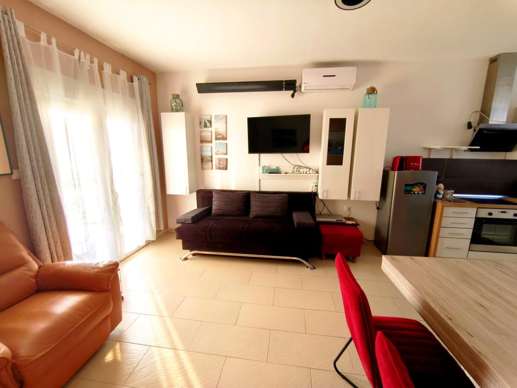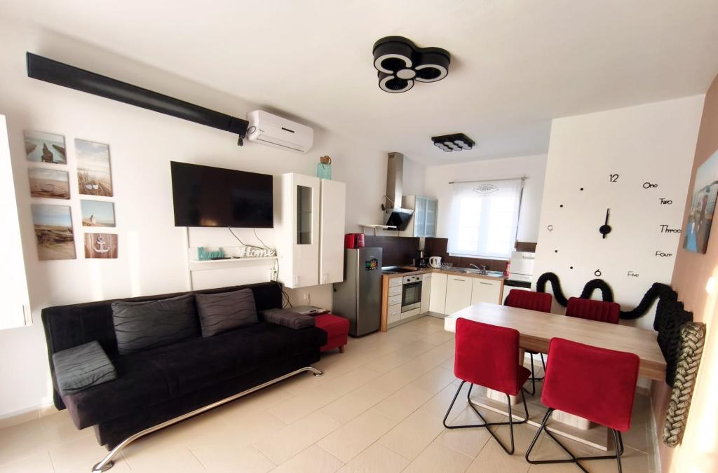 Полностью меблированная квартира, расположенная на первом этаже. Она состоит из одной спальни с двуспальной кроватью, кухни с обеденной зоной, туалета и гостиной с двумя диванами, один из которых можно расставить в дополнительную кровать. Также возможно размещение с домашними животными за дополнительную плату. У нас есть причал/буй, который наши гости могут использовать для швартовки своих небольших лодок.