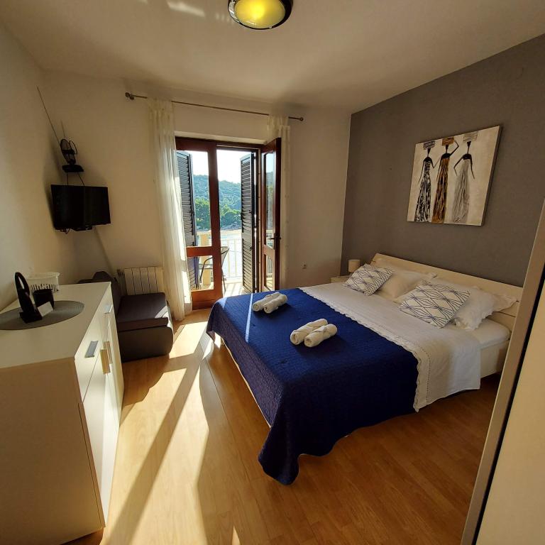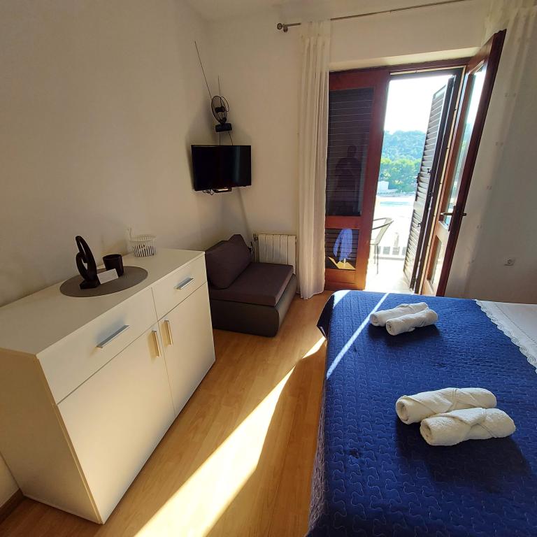 Дом находится примерно в 50 м от берега моря, ближайший ресторан примерно в 50 м, ближайший продуктовый магазин примерно в 50 м Дом в старинном далматинском стиле, в центре, с прекрасным видом на море , в тихом и спокойном месте, недалеко от пляжа (5-10 минут ходьбы), во дворе дома фруктовый сад, двор в тени зелени, у дома есть своя парковка. Бесплатный WI-FI, кондиционер. Дополнительные услуги: стирка белья возможна у хозяина по договоренности, хозяин реализует продукты питания собственного производства. (оливковое масло, коньяк)