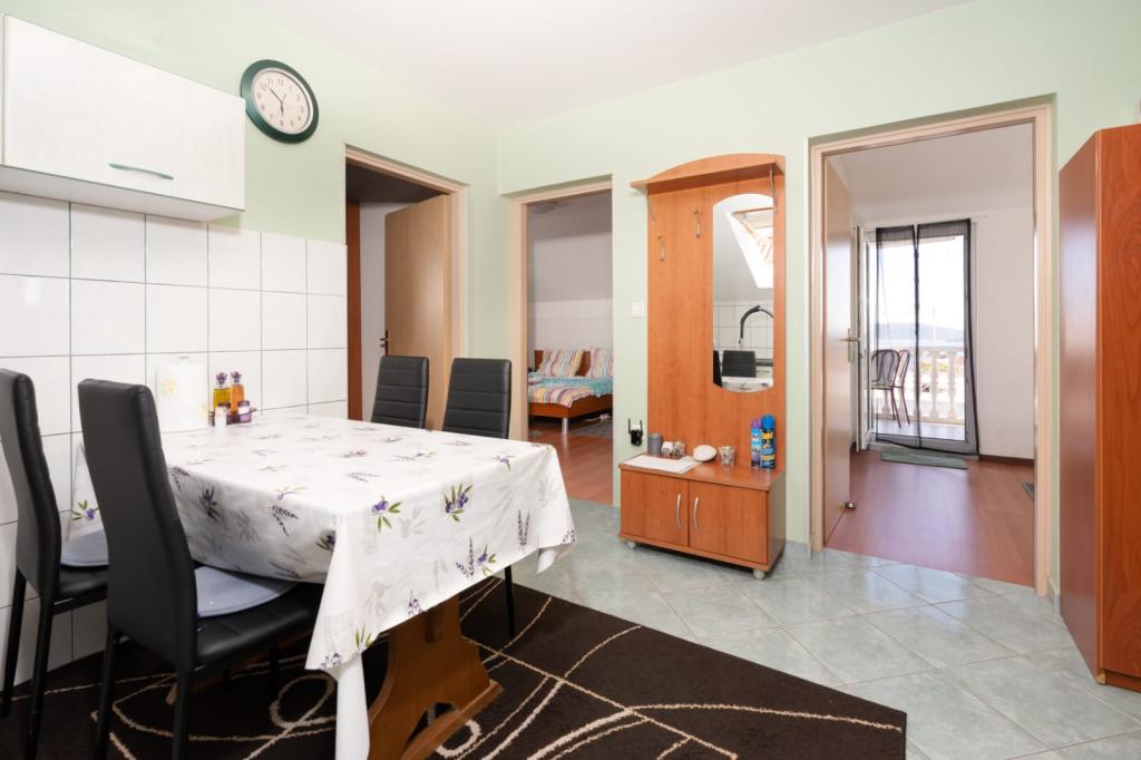 Полностью оборудованные трехкомнатные апартаменты площадью 90 м² с видом на море рассчитаны на 4–6 человек. К услугам гостей большая крытая парковка на 4 автомобиля, а также мангал и вертел на террасе во внутреннем дворе. Апартаменты расположены в 500 м от центра города, а до пляжа можно дойти пешком за 5–10 минут (примерно 400 м). В стоимость апартаментов включены Wi-Fi интернет, кондиционер, крытая парковка, пользование мангалом и туристический налог. Апартаменты предназначены в первую очередь для семей. Просим всех заинтересованных гостей перед отправкой запроса ознакомиться с разделами «Наличие» и «Прайс-лист». Бронирование по телефону невозможно. Благодарим за понимание.