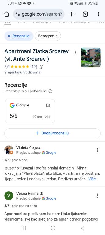Апартаменты Zlatka Srdarev расположены в тихой части города Водице, известной как Блата; возле отеля Пунта. Расстояние от апартаментов Zlatka до главного пляжа составляет всего 150 метров, а до центра города — 300 метров. Апартаменты расположены на частной улице и окружены красивой растительностью и средиземноморскими растениями, такими как оливковые деревья, виноград, инжир, киви... Мы можем похвастаться тем, что дважды были награждены за лучший ландшафтный сад. Гости могут воспользоваться принадлежностями для барбекю. Наши квартиры полностью отделены друг от друга, и каждая квартира имеет собственную террасу. Гости могут воспользоваться парковкой во дворе. Приходите и наслаждайтесь вместе с нами!