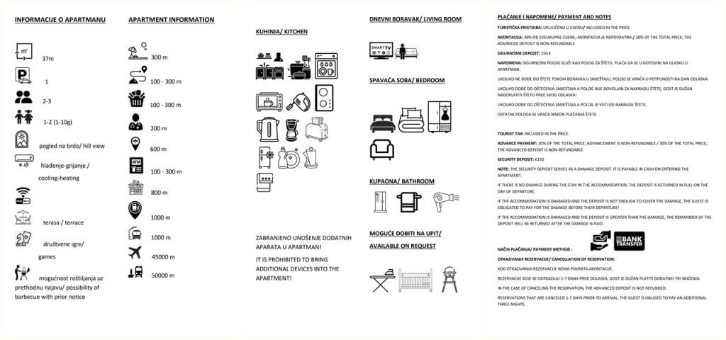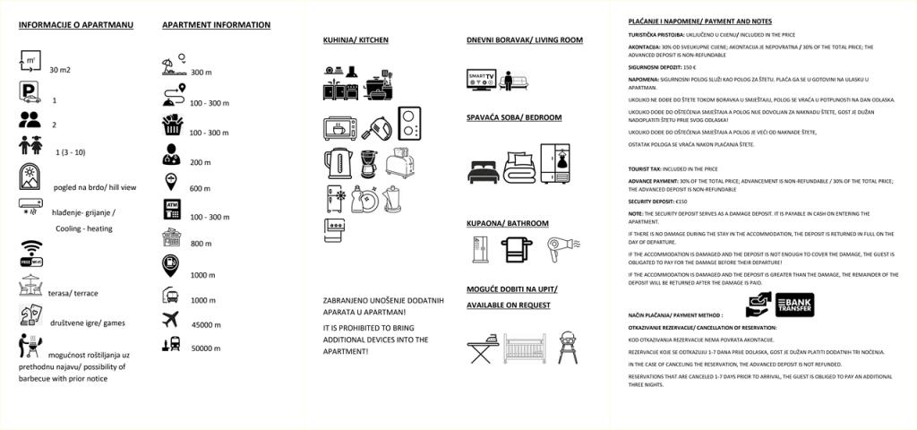 Прочитай выше Единица размещенияЗаезд/Выезд: Заезд после 14:00, выезд до 10:00. Оплата: Бронирование подтверждается предоплатой 30%. Остаток — по прибытии. Залог: 150 € при заезде (возвращается при выезде, если нет повреждений). Цены: Проживание до 3 ночей: +30%. Доплата за доп. человека: 10 €/ночь. Правила: Животные и незарегистрированные гости запрещены. Время тишины: 15-17 и 23-08. Сезон: Закрыто с 31.10 по 15.03. Бронирование на 2026 год с 01.01.2026.