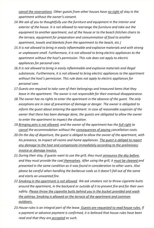 Прочитай выше Единица размещенияДо ТРЕХ ночей цена на 30% ДОРОЖЕ; ДОПОЛНИТЕЛЬНЫЙ ЧЕЛОВЕК платит 10 евро за ночь в зависимости от сезона. ВРЕМЯ ЗАЕЗДА: после 14:00; ВРЕМЯ ВЫЕЗДА: до 10:00; ПРЕДОПЛАТА составляет 30% от общей суммы, остальная часть при заезде в апартаменты; ЗАЛОГ НА СЛУЧАЙ УЩЕРБА составляет 150 евро, гость оплачивает его при заезде в апартаменты, если ничего не сломано, он возвращается при выезде; В доме есть ОДНО ПАРКОВОЧНОЕ МЕСТО на каждые апартаменты; ЗАПРЕЩЕНО: приводить с собой людей, не являющихся пользователями жилья, шуметь с 15:00 до 17:00 и с 23:00 до 20:00, привозить с собой домашних животных. Мы закрыты с 31.10.. по 15.03. Мы принимаем бронирования на 2026 год с 1.01.2026.