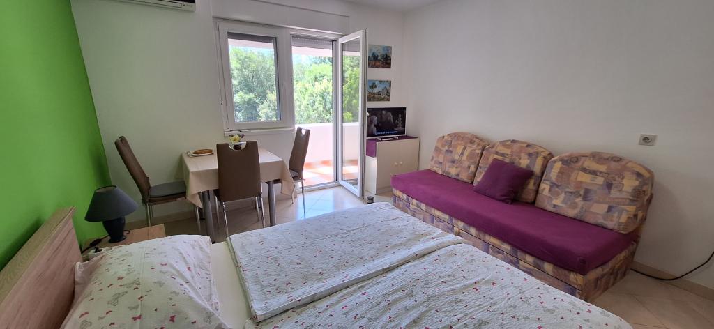 На первом этаже многоквартирного дома балкон с видом на лес и зелень. Спокойно и комфортно спать. Рядом находится теннисный корт, баскетбольная площадка, велосипедные дорожки, набережные и самая красивая и большая оливковая роща в Хорватии. Излюбленный семейный курорт для любителей природы. Природные пляжи, пристань для яхт, гриль, рестораны, магазины, пекарня, кондитерская и почта находятся в непосредственной близости от квартиры.