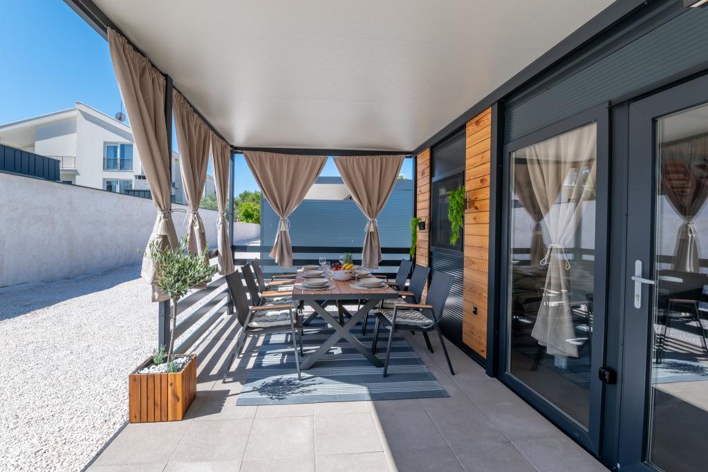 Откройте для себя идеальный отдых на море в наших очаровательных мобильных домах, которые расположены всего в 70 метрах от идиллического пляжа Порат в тихом городке Драге. Коттеджи обеспечивают оптимальное сочетание комфорта и природной среды и идеально подходят для семей или групп друзей, ищущих спокойного отдыха. В коттеджах две спальни. В одной установлена двуспальная кровать размером 160х200, а во второй комнате — двуспальная кровать размером 140х200. Дополнительно на диване-кровати может спать ребенок до 5 лет. В каждом номере удобные кровати и свежее постельное белье, что обеспечит вам отдых, которого вы заслуживаете. Гостиная оборудована современной мебелью и телевизором, идеально подходит для вечернего отдыха. Кухня полностью оборудована всей необходимой бытовой техникой, включая холодильник, плиту, кофемашину, чайник и микроволновую печь, что позволяет готовить блюда на свой вкус. Наслаждайтесь утренним кофе или вечерним напитком на просторной террасе площадью 24 м²!