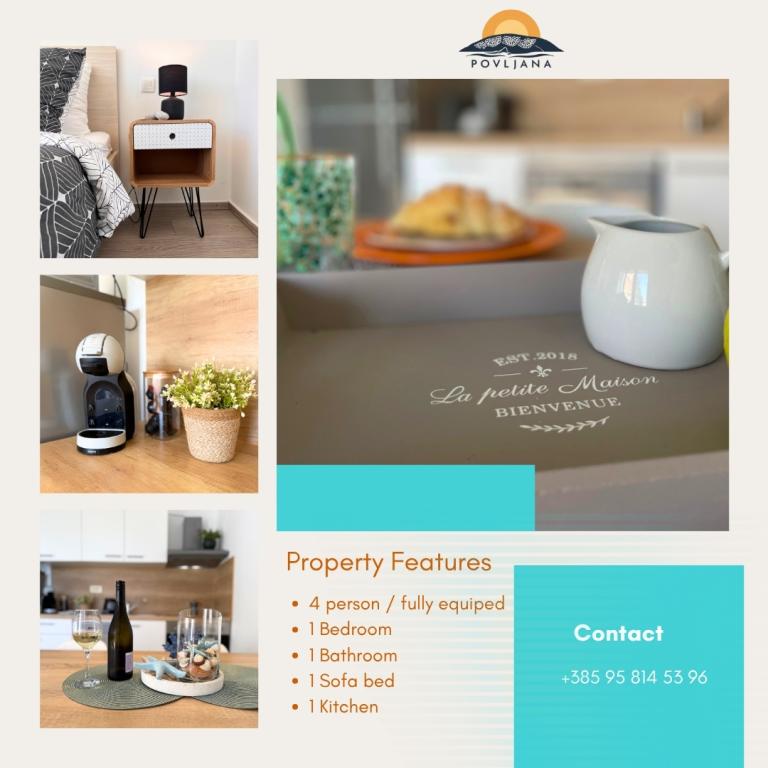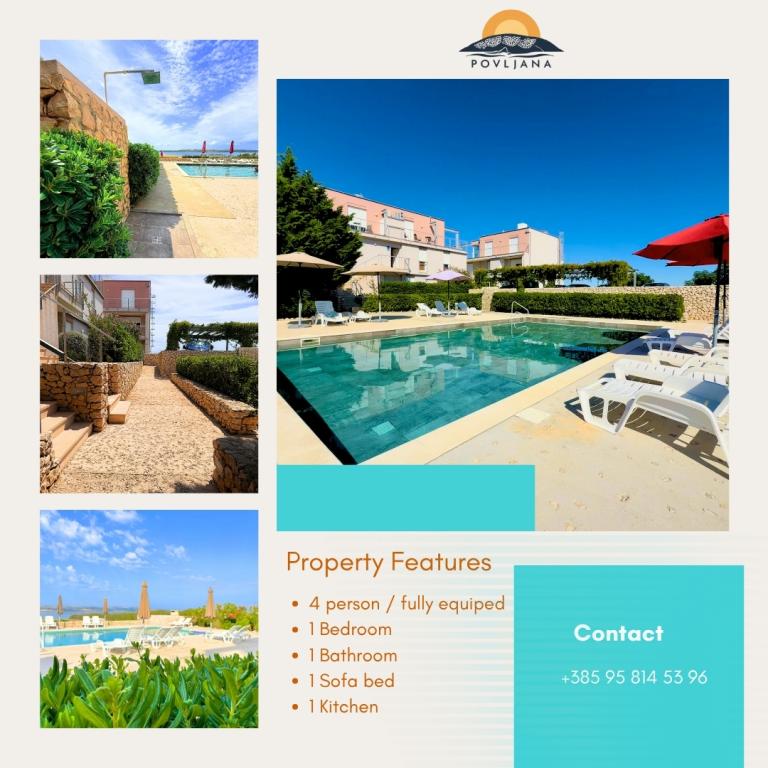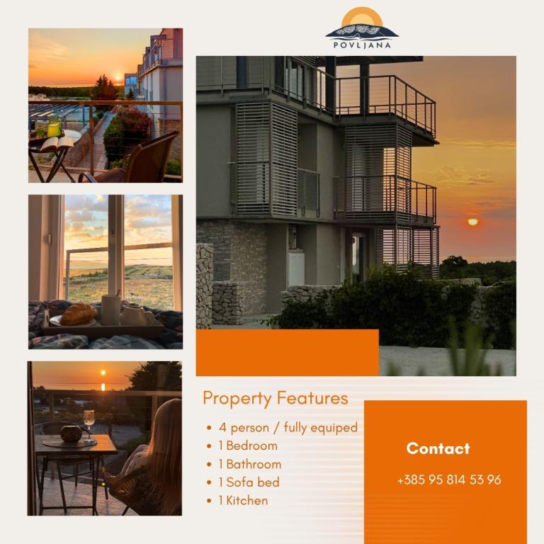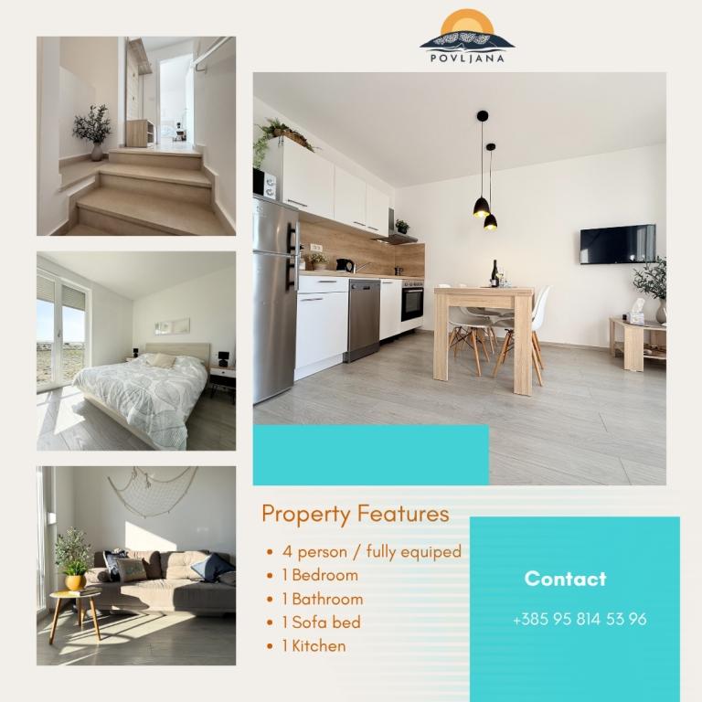 Современные апартаменты на полуострове Раставац с видом на Повляну и Велебит в комплексе «Лиепи оток». Апартаменты полностью оборудованы для комфортного проживания. Они состоят из 1 спальни с двуспальной кроватью и дополнительной раскладной кроватью на 2 человека в гостиной. Для гостей апартаментов предоставляется бесплатная парковка, бассейн, барбекю и общая игровая площадка (качели, настольный теннис). Тихий песчаный пляж расположен прямо под комплексом, в 150 метрах. Галечные и другие общественные песчаные пляжи находятся в 2-4 км. В непосредственной близости (200 м) находится недавно открытый кемпинг «Аминес Авалон», вход в кемпинг бесплатный (доступные удобства: магазин, тренажерный зал, пекарня, ресторан, аквапарк). Центр Повляны находится в 4 км. Если вы ищете спокойный отдых, захватывающие дух рассветы и закаты, чистое море и нетронутую природу, то Повляна — правильный выбор для вас.