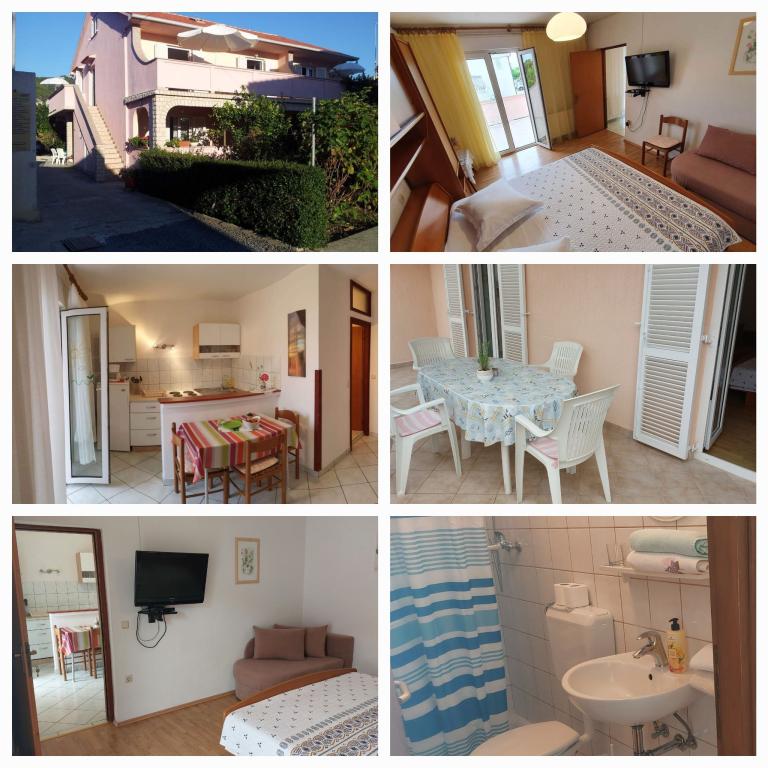 Мы сдаем в аренду полностью оборудованные апартаменты с кондиционером (на 2-5 человек) + спутниковое/ЖК-телевизор, каждый со своей террасой или балконом + парковочное место во дворе и высокоскоростной Интернет. Мы также предлагаем номера с кондиционером на 2-3 человека, каждый со своей террасой, туалетом/туалетом, а также возможностью использования полностью оборудованной кухни, столовой (SAT/LCDTV) и красивой открытой террасы с садовой мебелью. Мы находимся рядом с прекрасным песчано-галечным пляжем (200-250 м) и всеми другими удобствами, необходимыми для беззаботного и приятного летнего отдыха (магазины, рестораны, пиццерии, пляжные бары и кафе, развлекательные заведения, программы для детей...) . От старого центра города острова Раб с его богатой историей мы находимся всего в 20 минутах ходьбы по красивой набережной у моря.