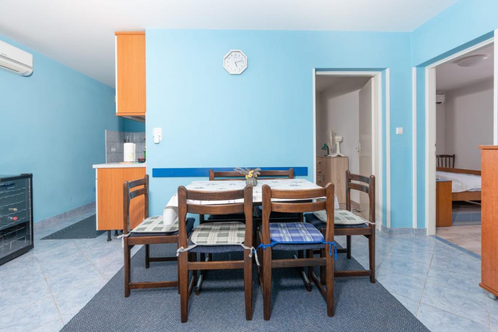 Полностью оборудованные трехкомнатные апартаменты площадью 90 м² с видом на море рассчитаны на 4–6 человек. К услугам гостей большая крытая парковка на 4 автомобиля, а также мангал и вертел на террасе во внутреннем дворе. Апартаменты расположены в 500 м от центра города, а до пляжа можно дойти пешком за 5–10 минут (примерно 400 м). В стоимость апартаментов включены Wi-Fi интернет, кондиционер, крытая парковка, пользование мангалом и туристический налог. Апартаменты предназначены в первую очередь для семей. Просим всех заинтересованных гостей перед отправкой запроса ознакомиться с разделами «Наличие» и «Прайс-лист». Бронирование по телефону невозможно. Благодарим за понимание.