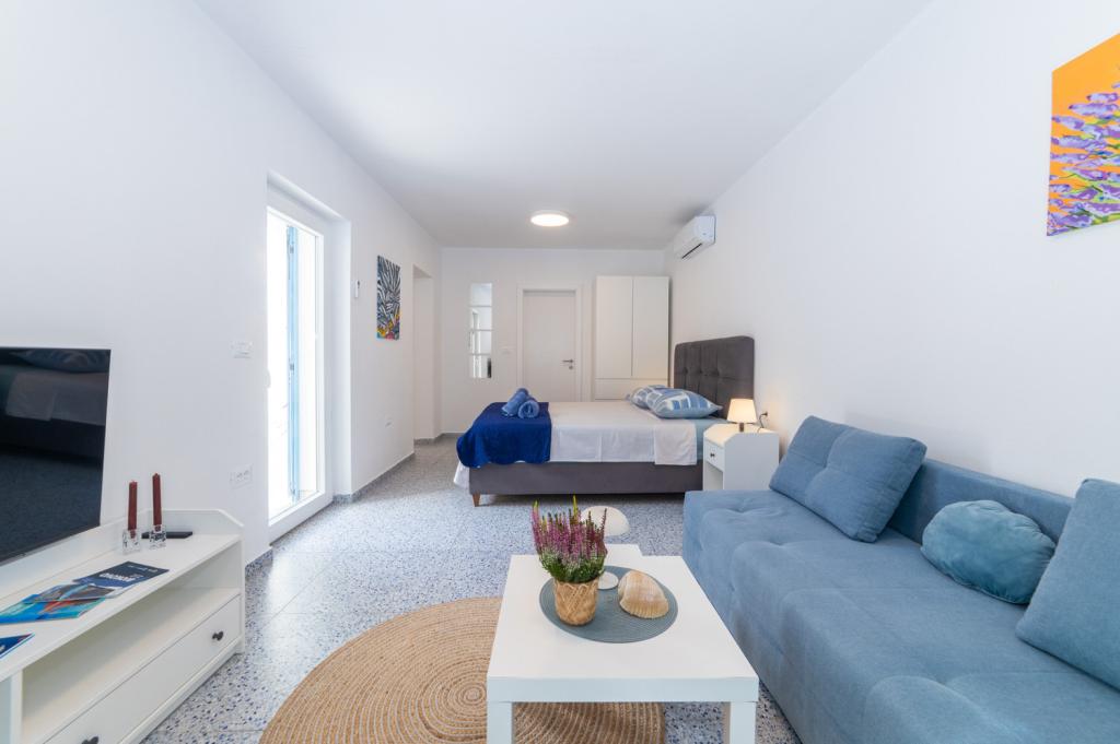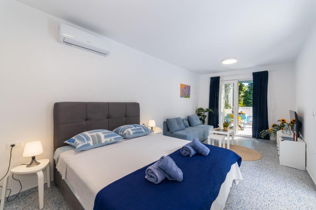 Мы остановились в номере студия+1, и мы в восторге от жилья, оно современно и стильно обставлено, в нем есть все необходимое для приятного отдыха, от удобных кроватей до кухни, на которой есть все (даже посудомоечная машина). мы пользовались бассейном.который является частью и дети веселились на батуте. Хозяева дружелюбны и всегда к вашим услугам. Пляжи близко, до них можно добраться за 3 минуты, а Заострог прекрасен, маленькое место, где есть все и много развлечений для детей... сюда стоит приехать!