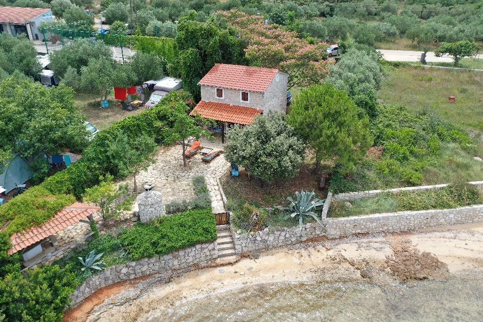 Дом расположен к югу от центра Ткона на острове Пашман, прямо у дороги. Вы можете проехать через ворота и припарковать машину прямо рядом с домом. Рядом с домом находится нудистский лагерь, скрытый от глаз вьющимися растениями. Первое здание с другой стороны находится в 50 метрах. Дом расположен в 10 метрах от моря и песчаного пляжа. Море около полуметра глубиной, дно песчаное, что идеально подходит для детей. Перед домом находится крытая деревянная терраса со столом и скамейками, где можно отдохнуть в тени и пообедать, а рядом с ней — каменный гриль. Также перед домом есть навес, обеспечивающий тень. На террасе есть душ на открытом воздухе.