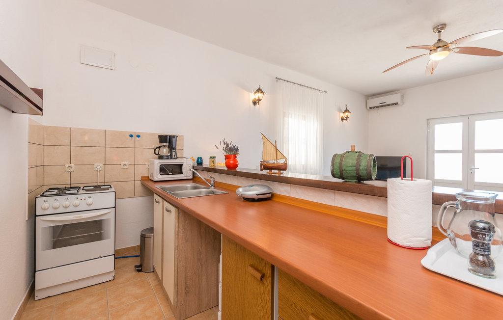 Просторная терраса с удобными шезлонгами и зонтиками, откуда открывается прекрасный вид на море, — прекрасное приглашение провести здесь отпуск. Отдохните с семьей в этом приятном месте. Мали-Иж, расположенный в среднем проливе между островами Углян и Дуги-Оток, окружен другими островками. Паромное и лодочное сообщение позволяет быстро добраться до него. В ресторанах подают отличные местные вина и изысканные далматинские блюда. Дом для отдыха состоит из просторной общей зоны, гостиной, кухни и столовой открытой планировки, двух спален и ванной комнаты. В одной спальне установлена двуспальная кровать размером 160×200 см, а в другой спальне — двухъярусная кровать размером 90×200 см. В доме есть просторная