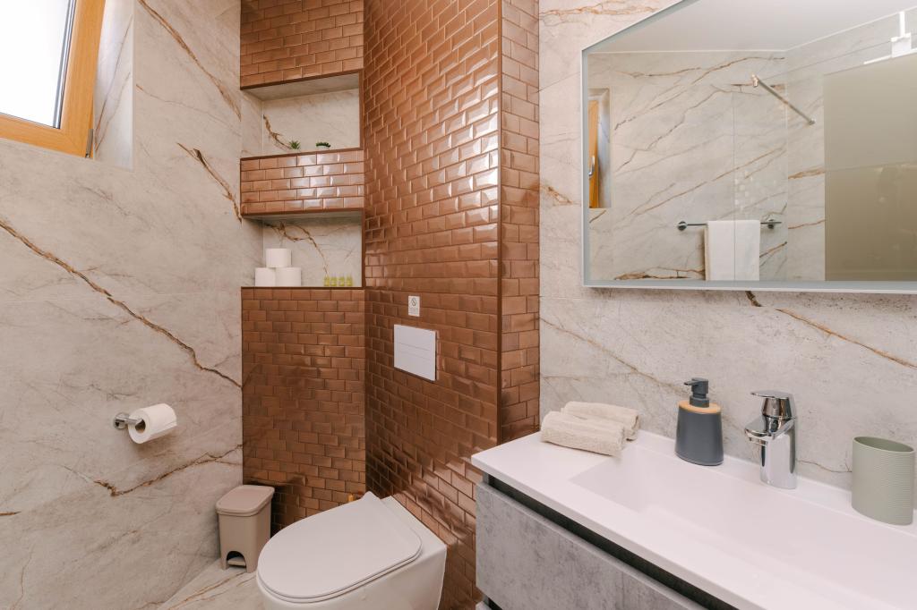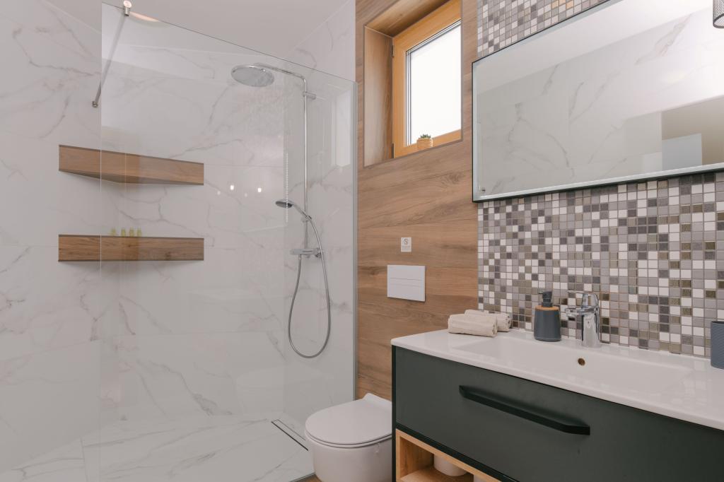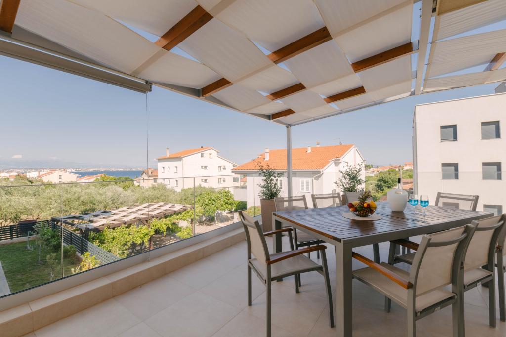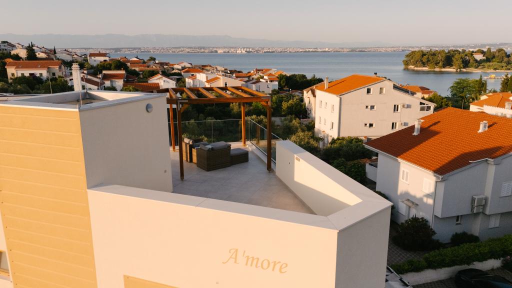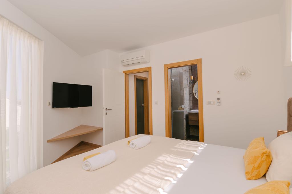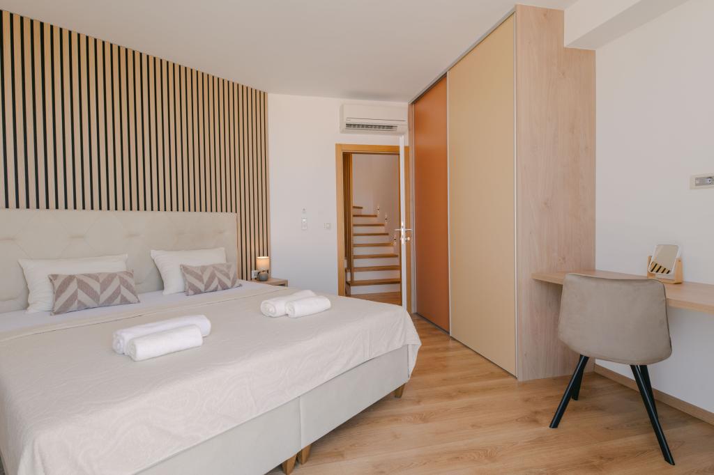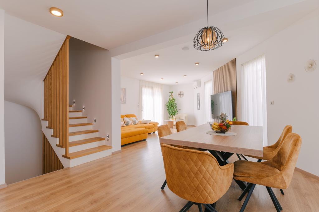 Три современные главные спальни расположены на верхнем этаже, а одна гостевая комната — в цокольном этаже. Все ванные комнаты оборудованы высококачественной сантехникой Grohe и Laufen, престижной дизайнерской керамической плиткой и элегантными стеклянными дверями. Дом официально классифицирован Министерством туризма Республики Хорватия, что позволяет с комфортом разместить 9, даже 10 гостей. Гостиная и столовая открытой планировки, а также каждая спальня обору
